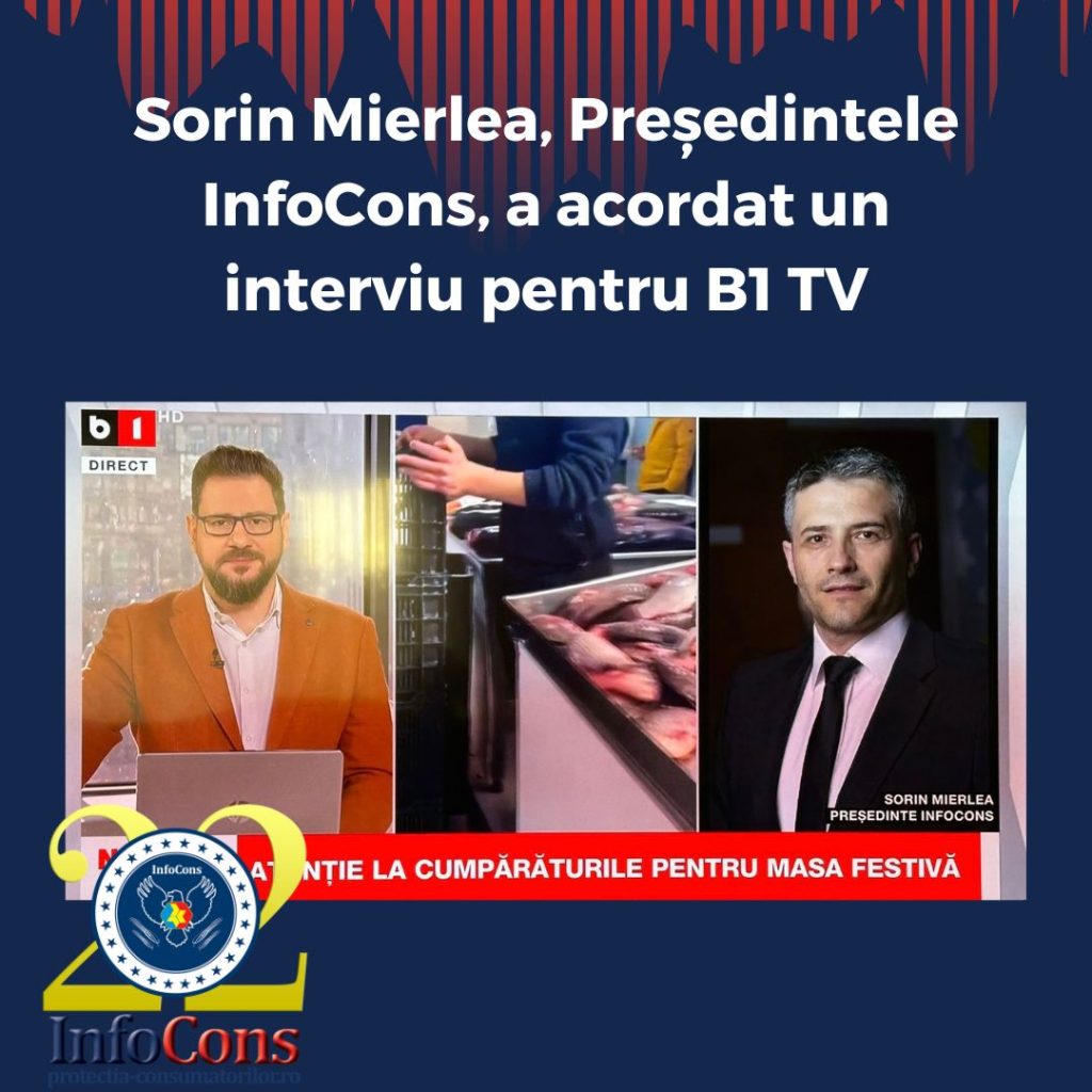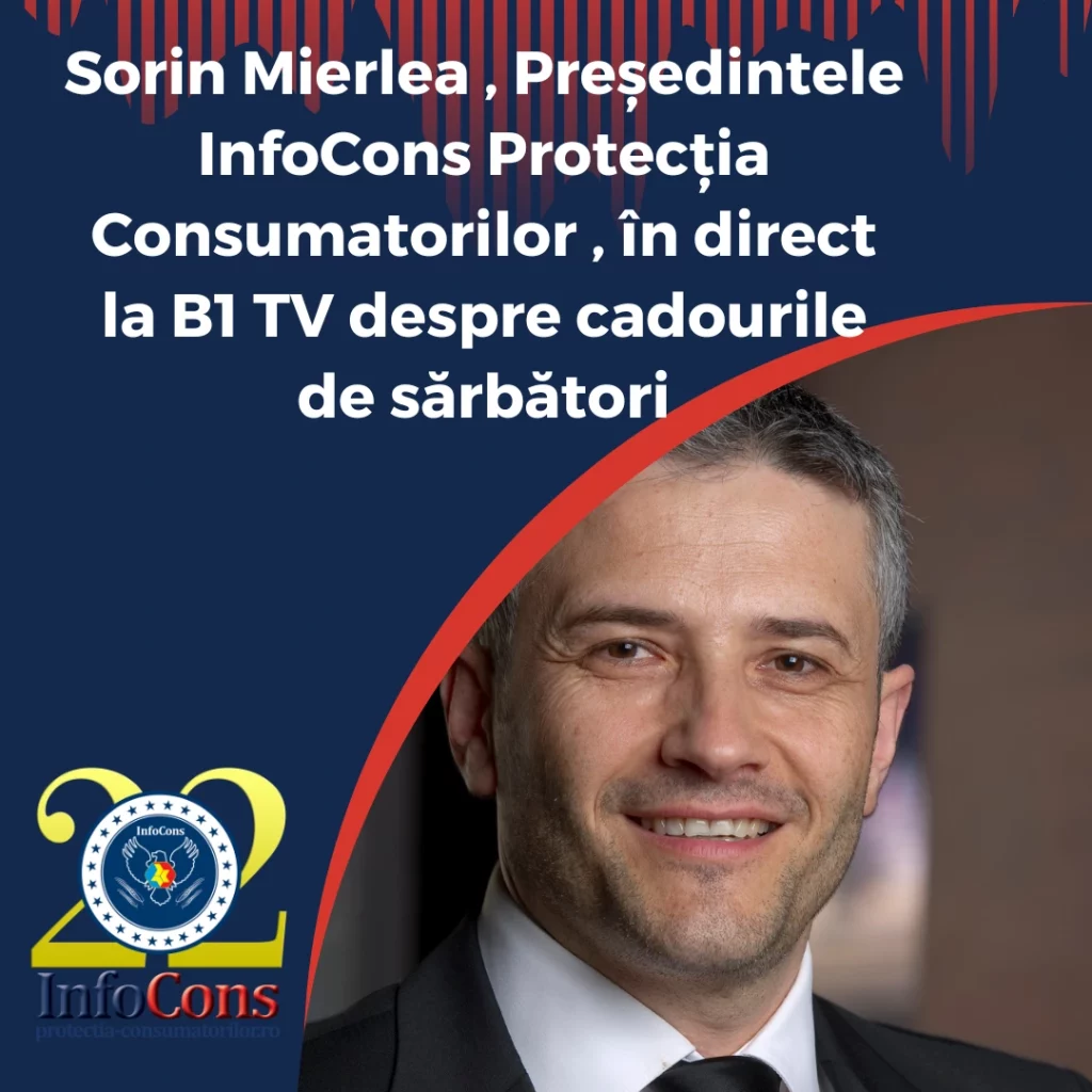 Sorin Mierlea , Președintele InfoCons Protecția Consumatorilor , a acordat un interviu pentru B1 TV despre produse neconforme în perioada Crăciunului în Aplicația InfoConsacum 2 săptămâni