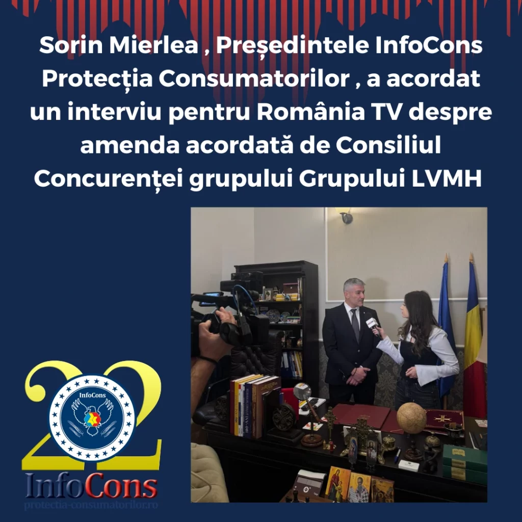 Sorin Mierlea , Președintele InfoCons Protecția Consumatorilor , a acordat un interviu pentru România TV despre amenda acordată de Consiliul Concurenței grupului Grupului LVMHacum 3 zile