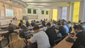 Domnul Sorin Mierlea , Președintele InfoCons , este prezent la o întâlnire cu studenții din cadrul Facultății de Economie Agroalimentară și a Mediului , parte a Academiei de Studii Economice din București , ce urmează cursul „Protecția consumatorilor de produse agroalimentare”.